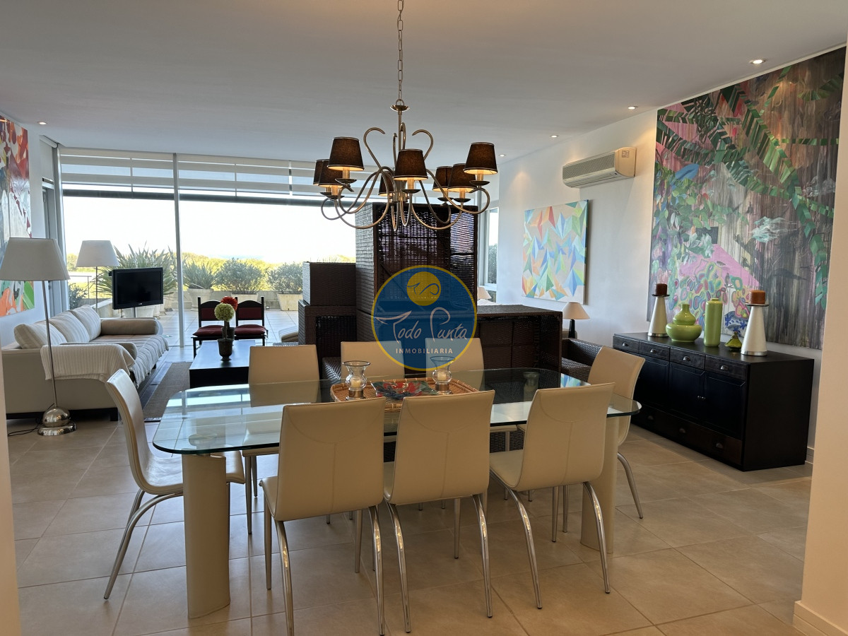 Amplio living-comedor, cocina americana, toilette, todo con salida a una super terraza con vista al mar, 3 dormitorios en suite, dependencia de servicio con baño, terraza atrás con parrillero propio, todo con toldos para las noches de verano, doble garage.