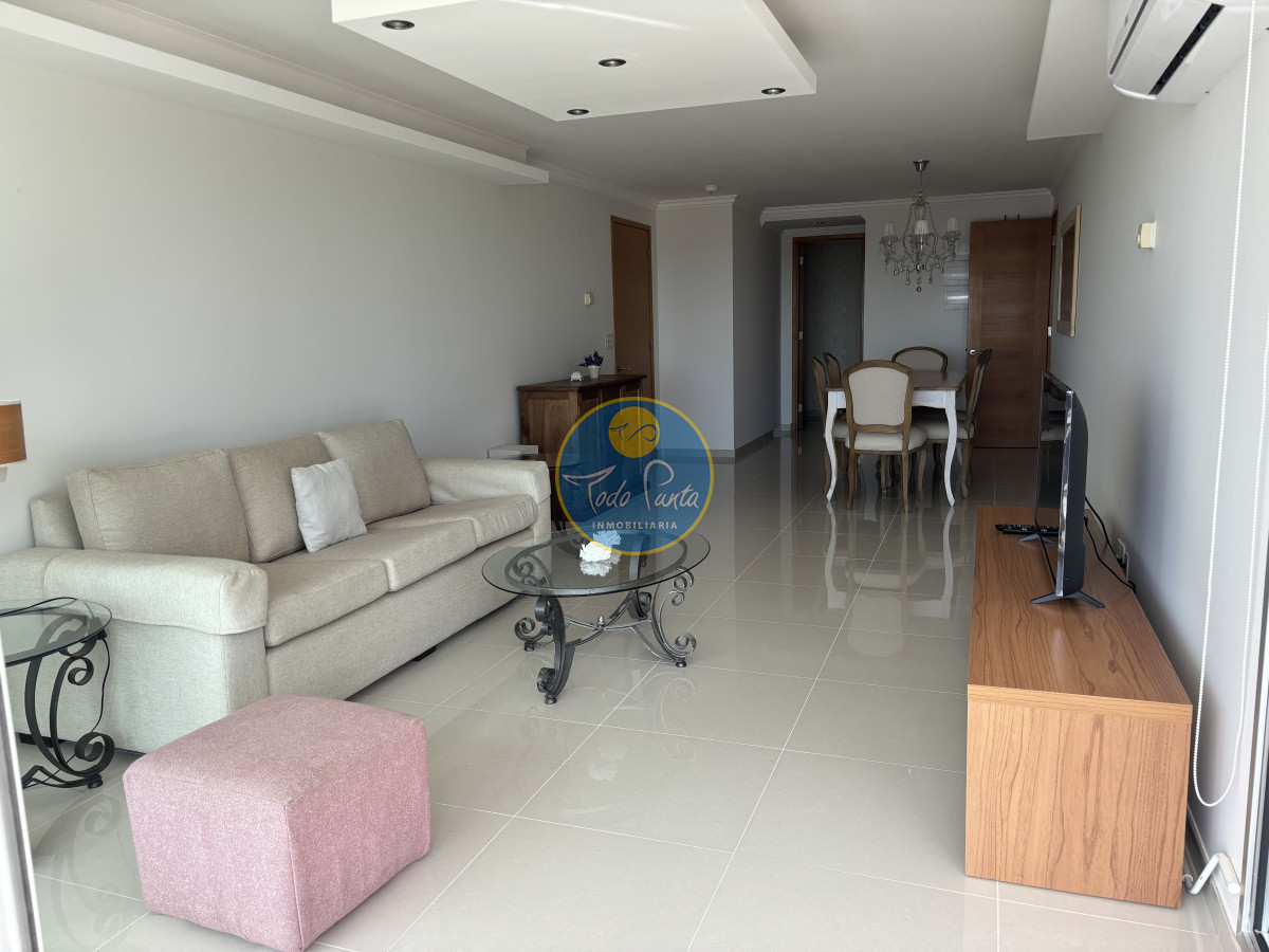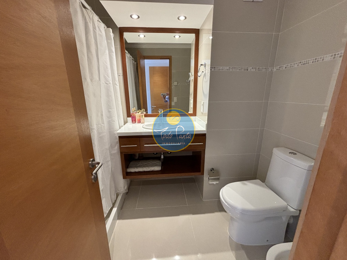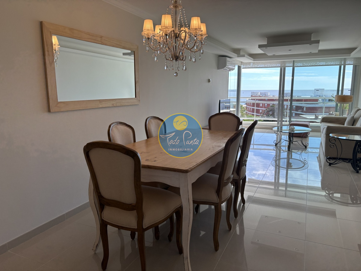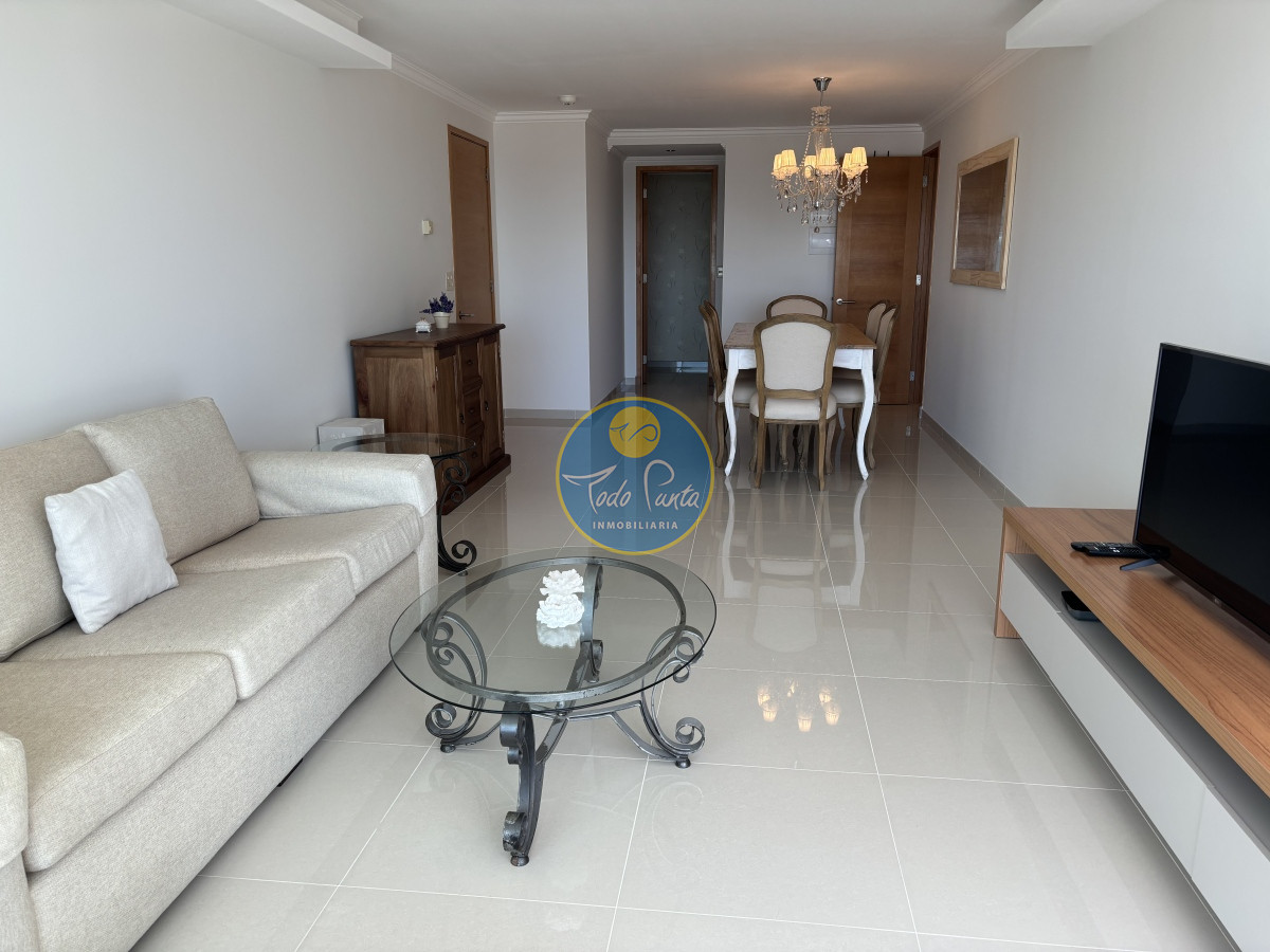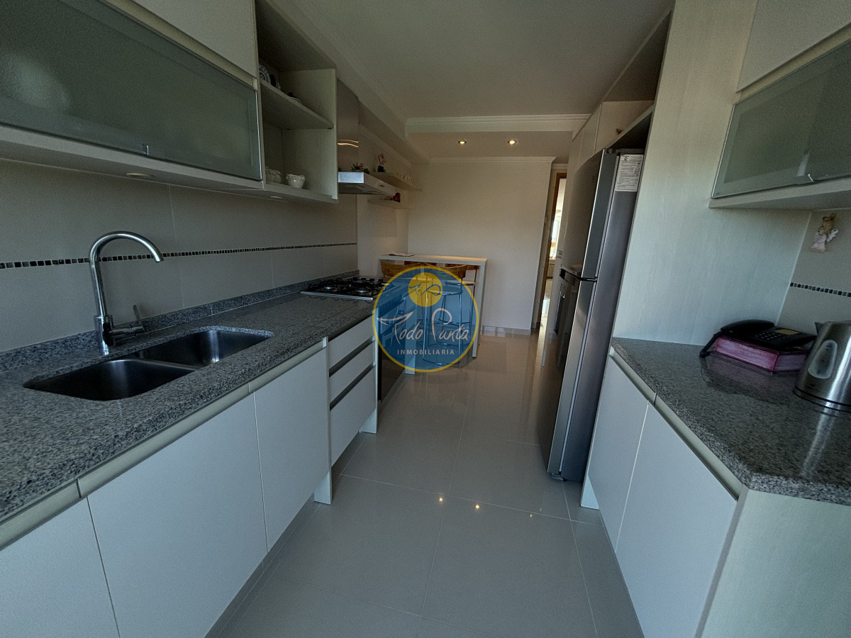 Edificio Sunrise Tower. Unidad central. Living comedor a gran balcon terraza y suite principal con vista al mar. Toilette de recepcion, cocina con desayunador, segunda suite mas dependencia de servicio con baño completo. Grandes detalles en los techos, molduras, muebles extras en los baños, empapelados y paredes con piedra. Garage en el primer subsuelo