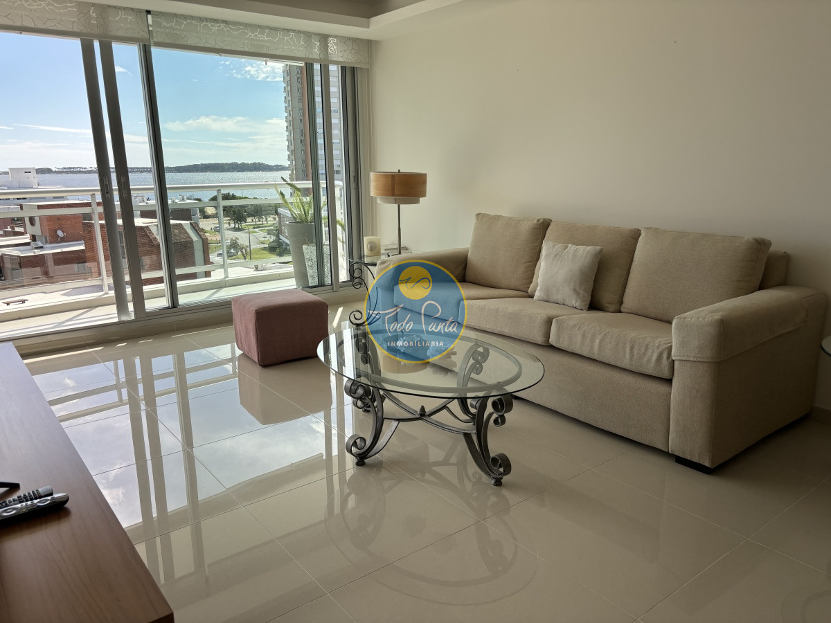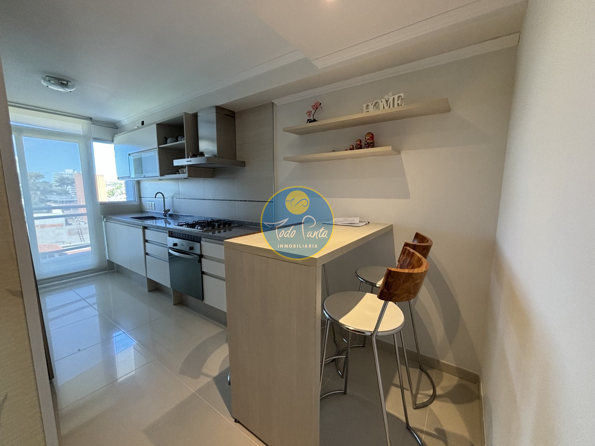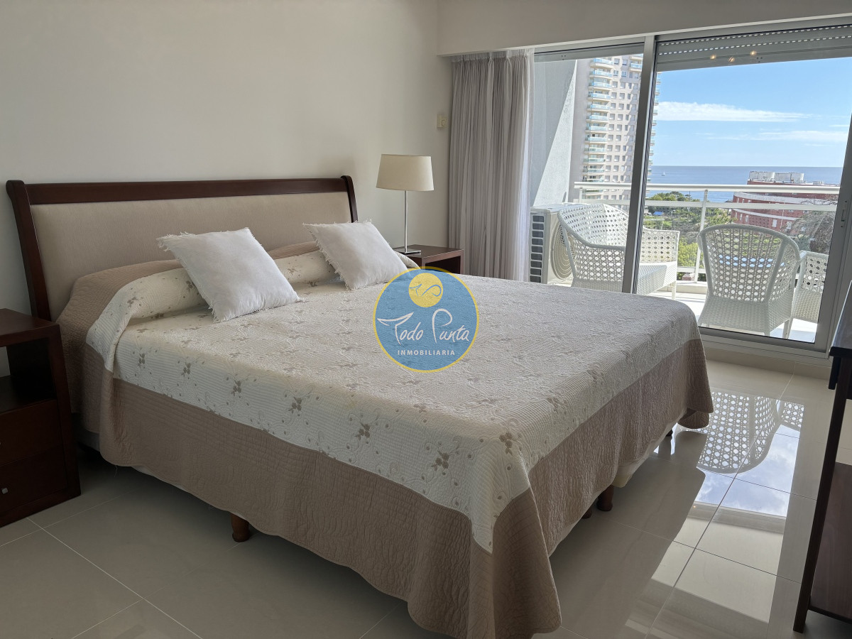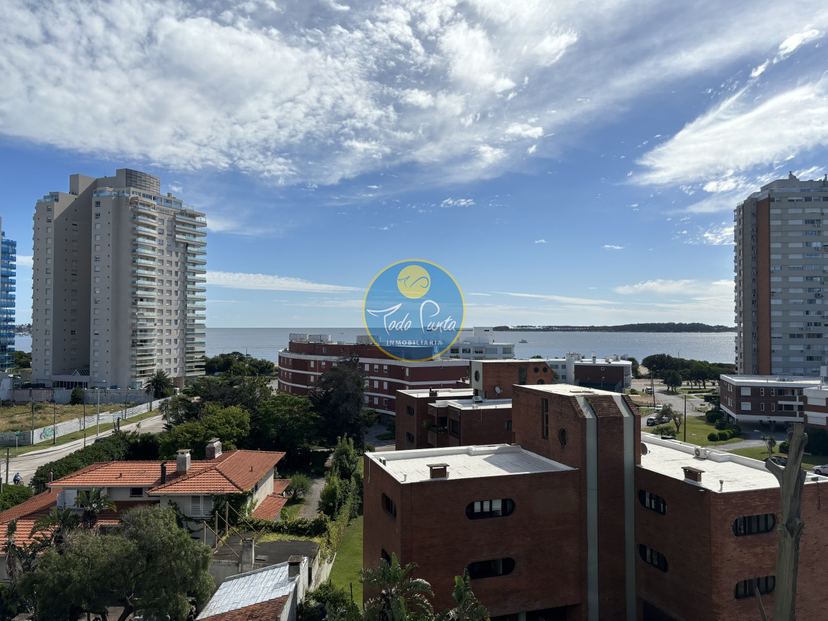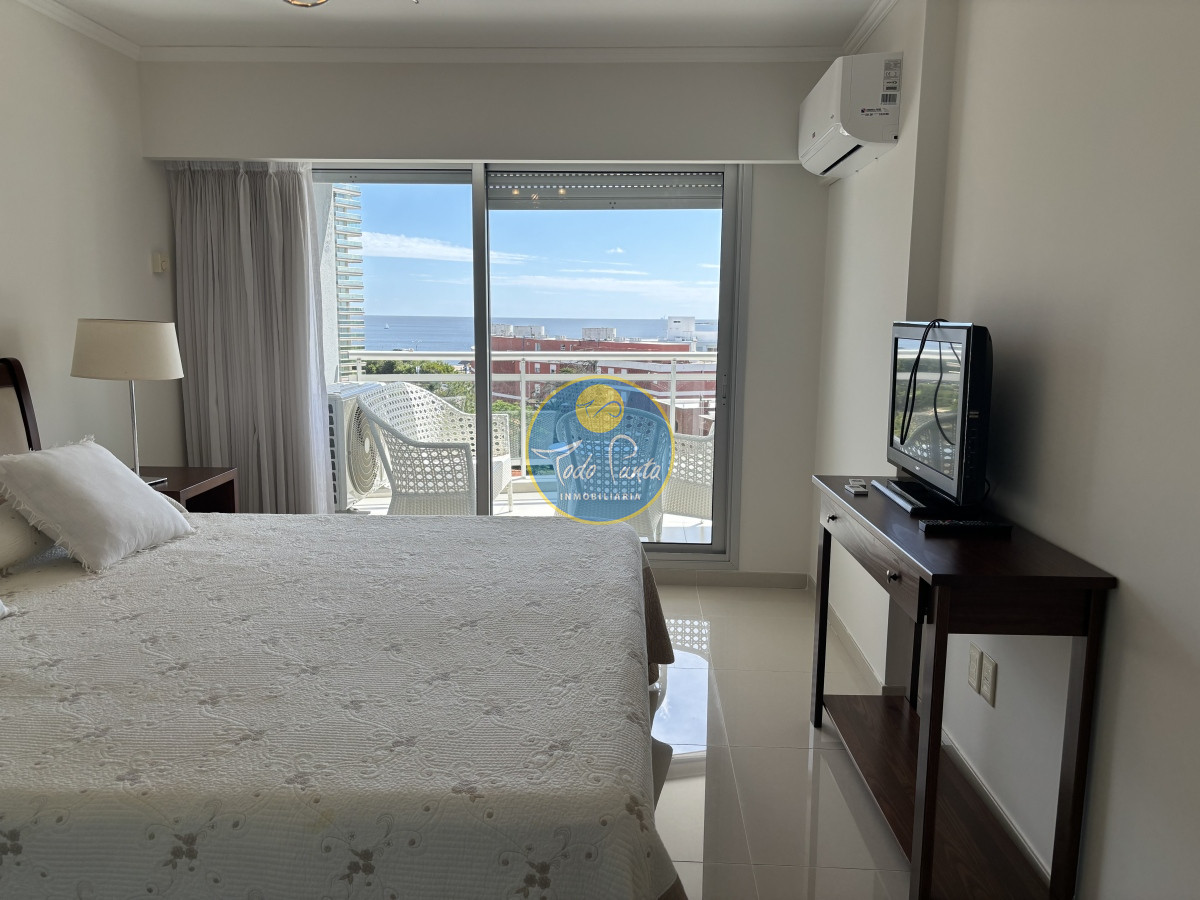 Edificio Sunrise Tower. Unidad central. Living comedor a gran balcon terraza y suite principal con vista al mar. Toilette de recepcion, cocina con desayunador, segunda suite mas dependencia de servicio con baño completo. Grandes detalles en los techos, molduras, muebles extras en los baños, empapelados y paredes con piedra. Garage en el primer subsuelo