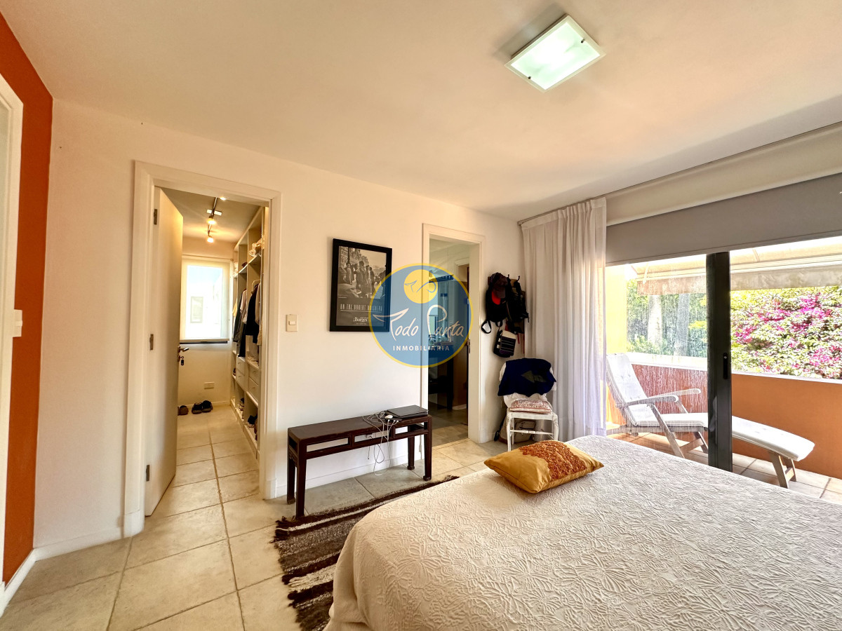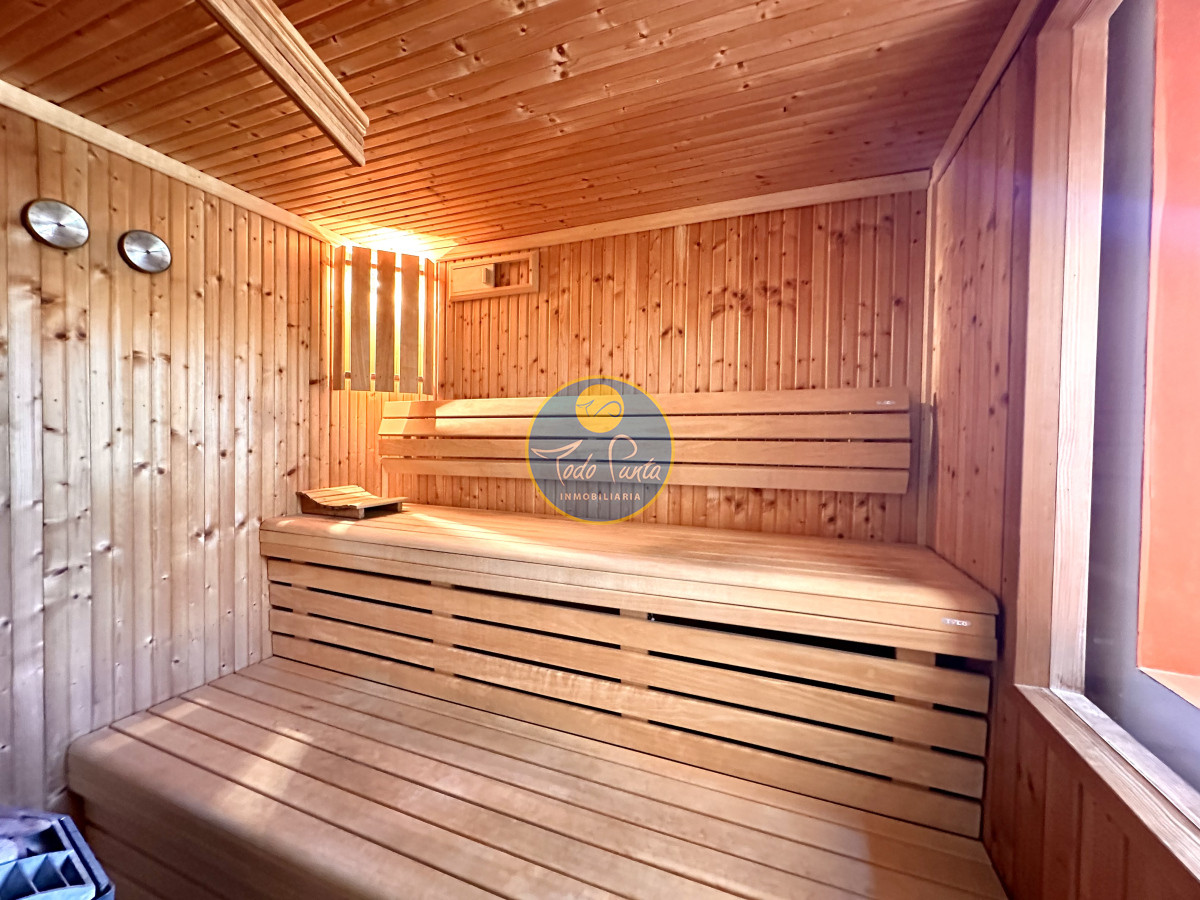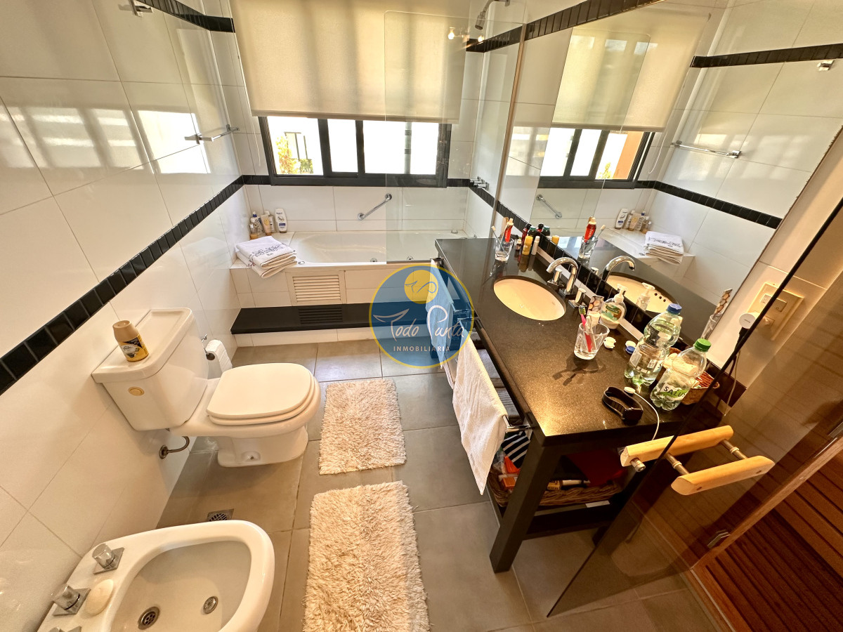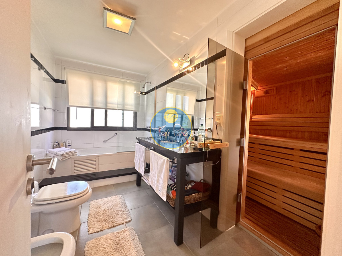 Tres dormitorios, dos baños, el principal en suite con vestidor , Sauna seco y balcón con vista al jardín .