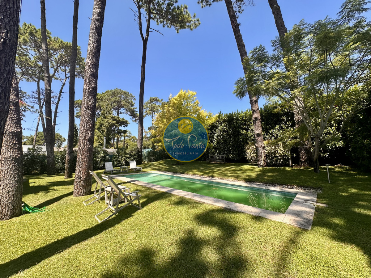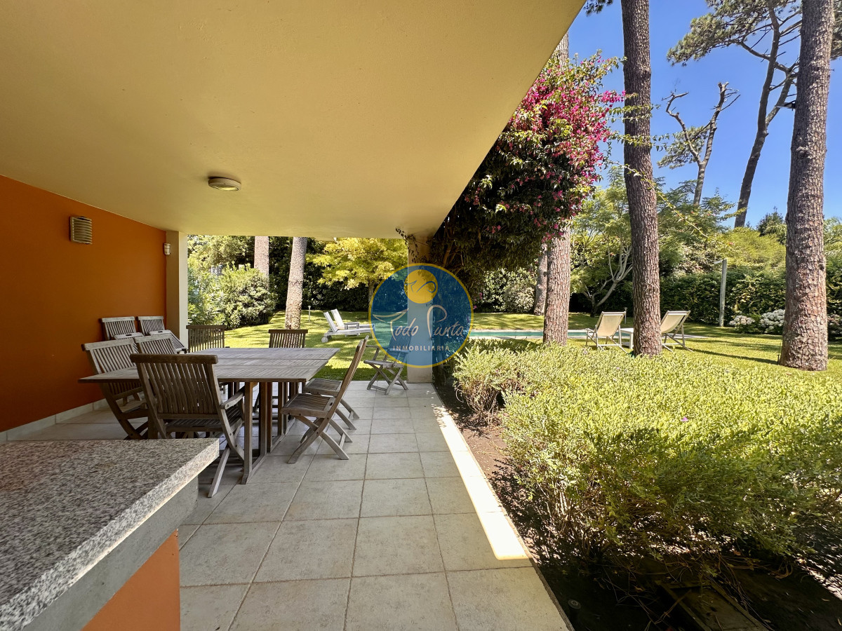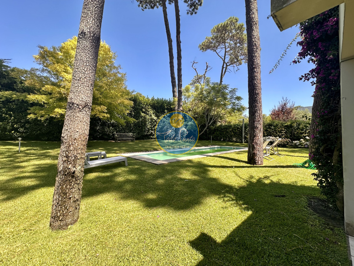 Hermoso jardín con piscina y parrillero techado.